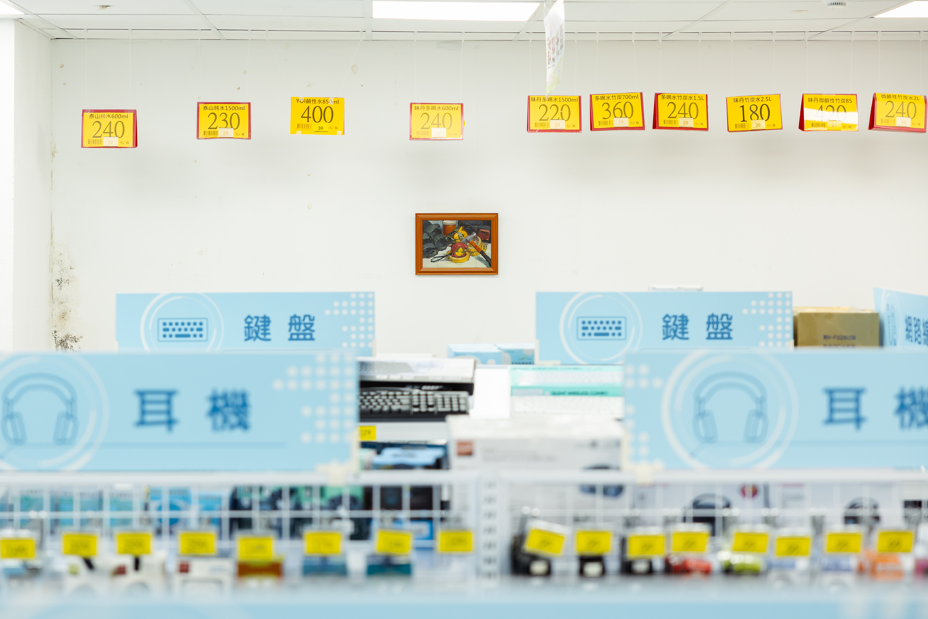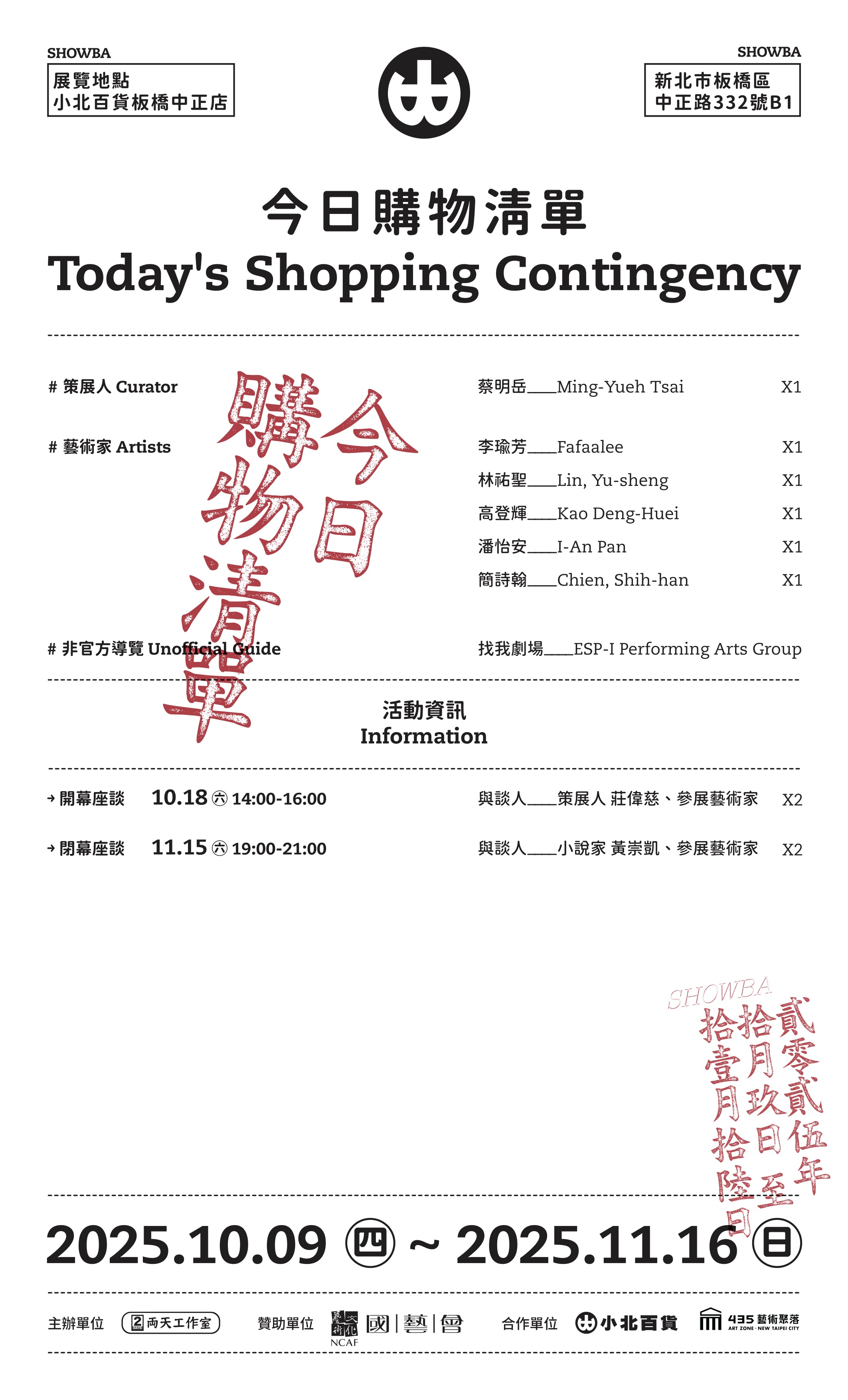In Today's Shopping Contingency, Six artists combine retail products with commercial space, embedding unexpected incidents within the gaps between merchandise. Lin Yu-sheng's “Convenience as Unit” examines how convenience services reshape life, thus beginning to "measure convenience" and presenting findings in the product promotion section. In “Indeed, this is catalog”, Chien Shih-han uses five major categories of SHOWBA products to create six spokesperson personas for drag queen "Hannah" distributed throughout the store, questioning what spokesperson images actually sell. Kao Deng-Huei's “Forget tomorrow's blur—focus on today's light” transforms the marketplace into a "still life classroom," converting products from objects of consumption into contemplated subjects in paintings. In “Ordinary Pleasures”, Fafaalee allows "functional objects" to carry painting, inserting everyday moments into the interstices of efficient living. I-An Pan's “Deep Down” reinterprets slow-selling products, finding for objects the possibility of whispered existence outside the sales system. ESP-I Performing Arts Group guides audiences through the marketplace via audio, where in “Unofficial Guide”, everyday products gradually become vessels of emotion.
